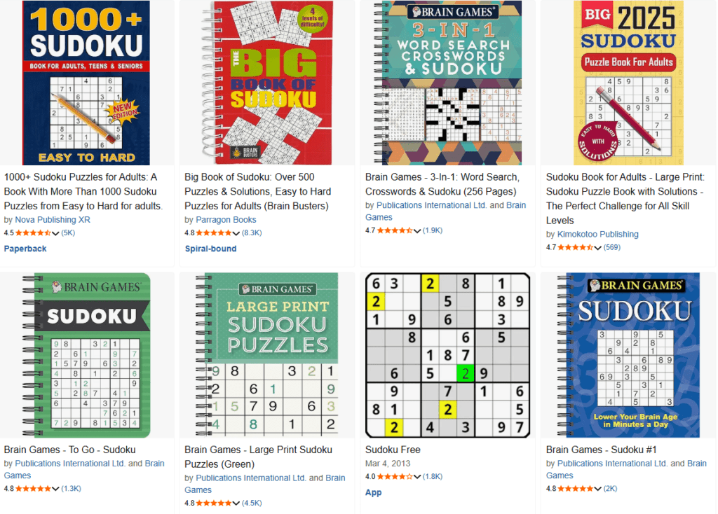If you browse through Amazon’s “Puzzle,” “Activity,” and “Brain Games” sections, you’ll see Sudoku books consistently ranking on the first pages — with both new and veteran creators releasing titles every single week. From large-print Sudoku for seniors to kids’ logic puzzles and themed Sudoku collections for holidays or relaxation, the demand just keeps growing.
